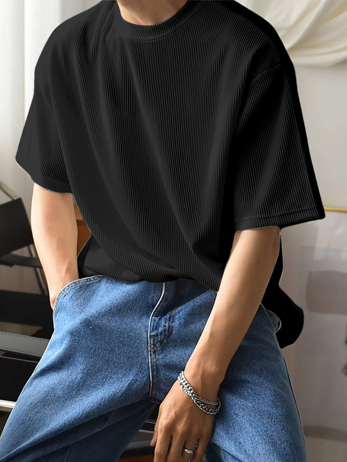 The Black Fine-Rib Plain T-Shirt is a staple piece designed for the modern professional seeking comfort without compromising on style. Made with a fine-rib fabric, this T-shirt offers a subtle texture that adds depth to its sleek black appearance, ensuring it stands out from your standard plain tee. Its tailored fit is engineered to enhance the silhouette, providing a smart, polished look suitable for both casual and semi-formal settings. The premium quality material ensures durability and breathability, making it an ideal choice for long days at the office or after-hours networking events. This T-shirt seamlessly blends functionality with fashion, making it a versatile addition to the executive wardrobe. Its understated elegance and superior comfort make it perfect for those who value sophistication and simplicity in their everyday attire.