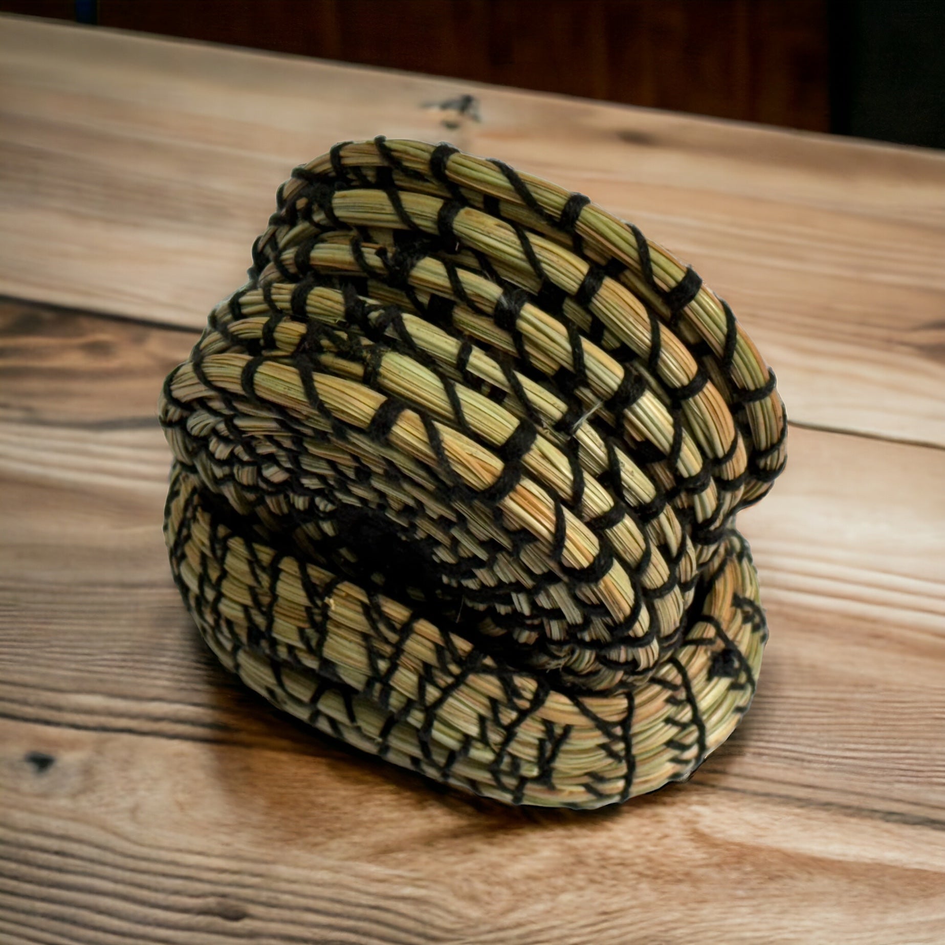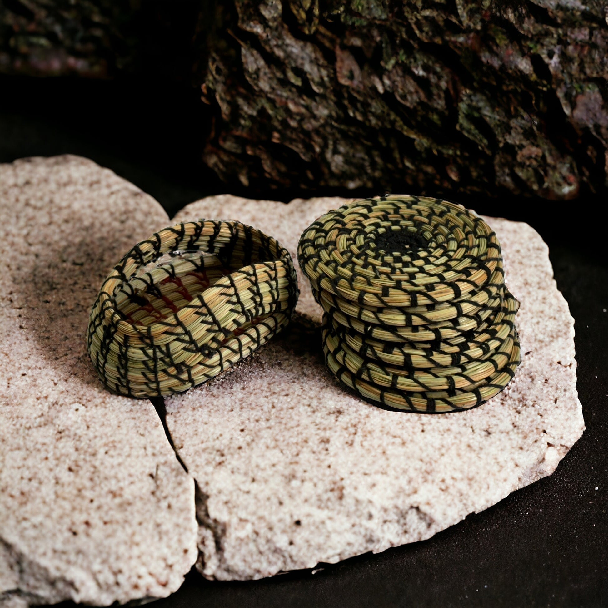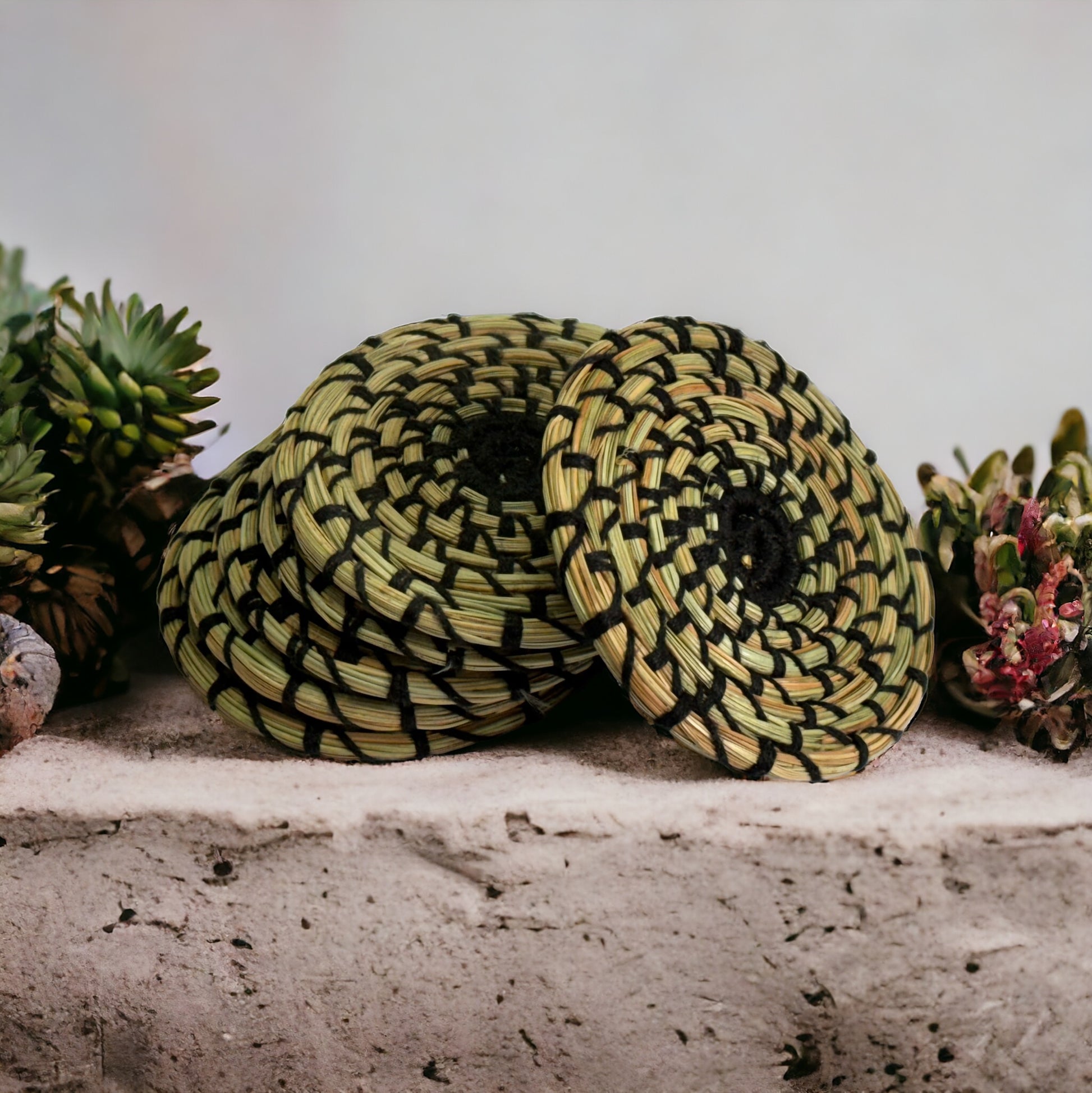 Discover unique, sustainable table top coasters crafted from 100% natural Himalayan pine needles, handpicked by the women of the Himalayas. This exquisite set, featuring six coasters and a stand, is intricately woven by the skilled women of the Sarogini group in Kot, Shimla.